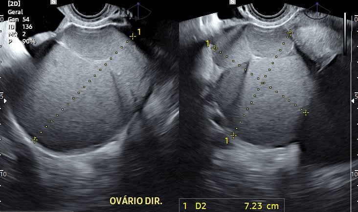 Ovários e útero: identificação de cistos endometrióticos e alterações morfológicas.